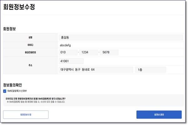 3. 내자녀 관리 : 자녀의 정보를 수정하고 싶다면, 해당 자녀의 [수정]버튼을 누르면 됩니다.